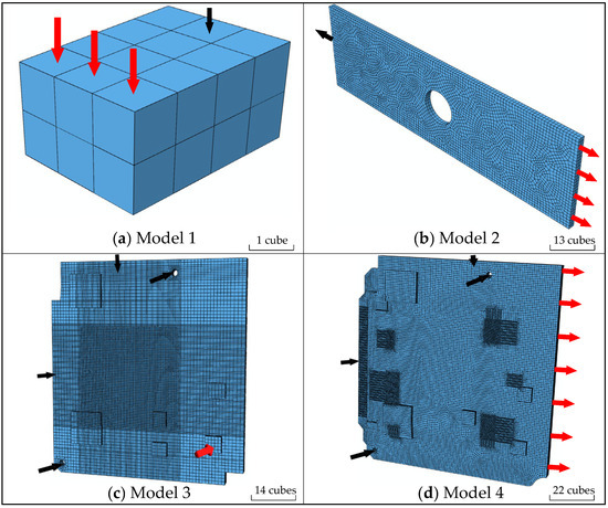 In order to evaluate the effectiveness of the proposed G-Pre preconditioning algorithm in practical applications, a total of four static analysis models were selected in this paper; their detailed information is shown in Table 3. Figure 9 shows a visual schematic of each model, where the red arrows indicate the forces applied to the finite element model, and the black arrows indicate the fixed constraints of the model. It should be noted that while the scale of each model only represents the size of its basic constituent finite element mesh, there were also encrypted meshes within the different models that were smaller in size. A brief description of the different models is given below. Model 1 represents a simple cantilever beam with one end fixed and the other end subjected to a static load. Model 2 depicts a perforated plate structure with one end fixed and the other end subjected to a static tensile force aligned with the surface of the plate. Model 3 is a simple printed circuit board with two sides and a fixed through-hole; there is a static force acting on one corner of the board. Model 4 is a BGA circuit board with the bottom edge, holes, and two sides held stationary, and a static force acting on one side of the board.