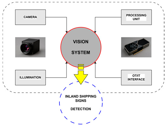In general, processing imaging data with vision systems has various applications, such as inspections, analyses related to object detection and classification, environmental health monitoring, anomaly detection, and many more. Vision systems also have many advantages, such as accuracy and speed of detection, adaptation to changing conditions, or the elimination of human errors. This allows them to operate in real-time, detecting signs with high precision, even in harsh environmental conditions. By using the learning capacity of the neural networks used in them, they can be trained on different data sets. This translates into their effectiveness in various environmental conditions. An undoubted advantage may also be the ability to support the ship’s crew in the process of identifying shipping marks, which automatically translates into a reduction in the risk of human error. The above features of the systems can bring many benefits, including increasing the safety of navigation, automating navigation processes, or preparing this technology for tasks related to autonomous inland waterway transport. The schematic role of vision systems in inland shipping sign detection is illustrated in Figure 1.