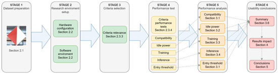 The research process concerning the usability analysis of graphics cards in vision systems, presented in Figure 2, begins with dataset preparation (STAGE 1) and concludes with the formulation of usability conclusions (STAGE 6). In the first stage, a dataset comprising images and their annotations is prepared. The next step (STAGE 2) involves setting up the research environment, including both hardware and software configurations. STAGE 3 focuses on the selection of evaluation criteria and determining their relevance. During STAGE 4, performance tests are conducted across five groups of criteria: compatibility, idle power consumption, training, inference, and the entry threshold to the technology. The fifth stage concentrates on a detailed analysis of the test results, with each criterion group discussed in a separate subsection in part three of the thesis. Finally, STAGE 6 presents the usability conclusions, encompassing a summary, the impact of results, and general findings. The diagram below illustrates the interconnections between the individual stages of the research process, leading to conclusions regarding the usability of consumer GPUs in vision-based applications.