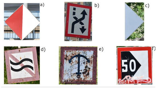Example of notice marks: (a) notice mark against the background of a bridge, (b) notice mark against the background of buildings, (c) notice mark against the background of vegetation, (d) old notice mark, (e) rusty notice mark, and (f) sprayed notice mark.