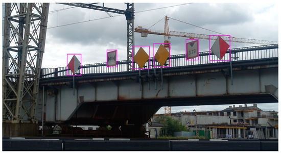 All the networks used in this work for object detection were trained using a set of real photographs depicting navigational signs of inland navigation. The photographs show signs on various backgrounds, including bridges, buildings, elements of coastal infrastructure, and vegetation. The collection includes intakes taken both from the water and wharves, all of which were taken during the day in various meteorological conditions. The following situations can be specified: sunny days (normal and against the sun photos), slightly cloudy days, or foggy and heavily cloudy days. A total of 1923 photos with resolutions from 2304 × 3072 to 6000 × 4000 were collected, on which a total of 4153 objects were marked. The image dataset used in the study includes high-resolution images in the JPEG format. The dimensions of the images range from 2304 × 3072 to 6000 × 4000 pixels, with an average size of 4543.7 × 3100.4 pixels and an average aspect ratio of 1.45. File sizes range from 746.5 KB to 22 MB, with an average of 6.9 MB, reflecting the detailed visual content of the dataset. The images were taken with different cameras: Nikon D5000 (558 images), Canon PowerShot A710 IS (544), Nikon D7200 (556), DSC-RX100M3 (206), Sony Xperia Z3 Compact (23), and uTough-8010 (36). The time distribution covers the years 2008–2022, with the highest number of images recorded in 2022 (913) and 2010 (502). The images were acquired on the Oder River basin, covering the range from Szczecin to the tributary of the Nysa Łużycka River. The pictures were taken from boat and on land, often using changes in zoom to differentiate the scale of the pictures. Due to image acquisition within urbanized and non-urbanized areas, signs had various backgrounds: high and low vegetation, buildings, bridges, and often a mix of them.