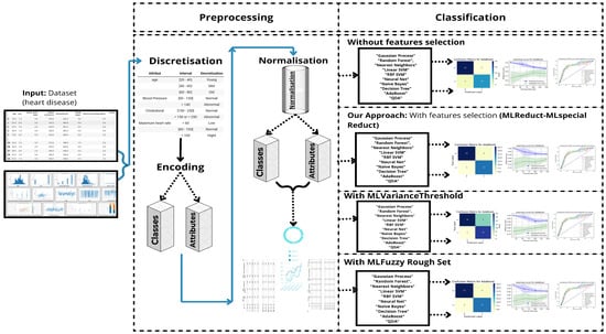 Our methodology integrates Rough Set Theory (RST)-based feature selection with preprocessing and classification steps to enhance machine learning performance. Figure 1 provides an overview of the general architecture of our framework, illustrating the flow from data preprocessing to model evaluation.