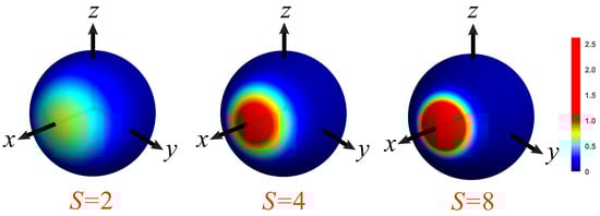 This Wigner function for the coherent state (24) is represented for various values of S in Figure 1. As we can appreciate, this function is sharply peaked around the classical phase space point and spreads over an area proportional to . As S increases, the state becomes increasingly localized and so more classical.