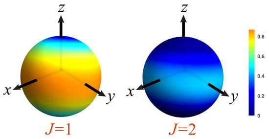 An important remark is in order. Since we do not fix the dimension of the group representation, the quantizer—and consequently the associated symbols—depends on three angles. In this setting, the mapping defined in (40) does not correspond to a representation of operators on a classical phase space, which must possess even dimensionality. The key distinction from the conventional Stratonovich–Weyl mapping lies in its capacity to fully reconstruct an operator, including the density matrix, rather than merely projecting onto irreducible subspaces. Nevertheless, the J-symbol of any operator confined to a single SU(2) irreducible representation is independent from the angle and adheres to the standard Stratonovich–Weyl form. It is also noteworthy that the index J assumes only integer values for symbols that do not depend on the angle .