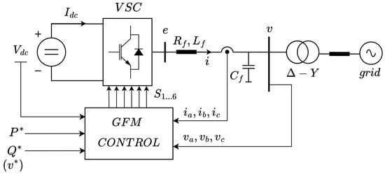 Figure 1 illustrates the schematic of a two-level Voltage Source Converter (VSC) connected to the grid through a filter, where and represent the inductance and resistance of the coil, respectively. The converter current i is measured at this point, while the capacitance is where the output voltage v is measured. The parameter e represents the internally generated voltage of the converter.