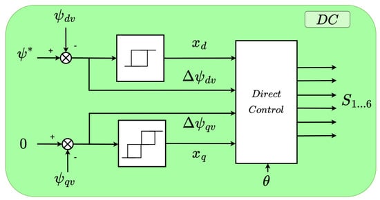 Furthermore, to select the appropriate voltage vector to be applied, a decision must be made regarding whether to prioritize the error in or . In the developed control algorithm, the component with the larger error is given higher priority. Based on these conditions, the switching logic for direct control is summarized in Table 2.