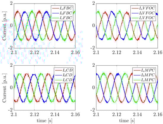 On the side of the inverter, both the current () and voltage () are measured. Using these measurements, along with the reference values for active power () and reactive power (), the four control schemes analyzed in this article can be implemented. These schemes generate the corresponding switching pattern defined by the six switching signals ().