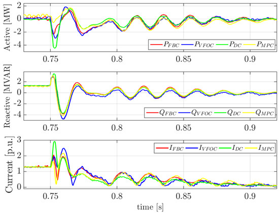 Finally, an essential aspect in the design of GFM is the implementation of current limitation mechanisms, as these converters can withstand significantly lower overcurrents compared to SGs [48]. The literature presents various strategies to mitigate overcurrents during critical disturbances, such as voltage sags. One proposed approach involves switching the converter to GFL mode during disturbances. However, as previously discussed, this method can lead to stability issues [49,50]. Another widely implemented technique is saturating the current regulators, but this can adversely affect the control angle, potentially compromising the converter’s stability [51,52,53]. The use of virtual impedances is also a common solution [54,55]; however, its design and parameterization remain a complex challenge [56]. More recently, a novel control architecture has been proposed to limit current in a straightforward manner. This approach is a synchronous machine-based controller and is based on virtual flux-oriented control (VFOC), eliminating conventional current control loops, which enhances system robustness and stability [57]. Additionally, by incorporating two control blocks that influence both the control angle and the magnitude of the reference flux, this method effectively limits both active and reactive currents, demonstrating strong performance even in commercial converters [58].