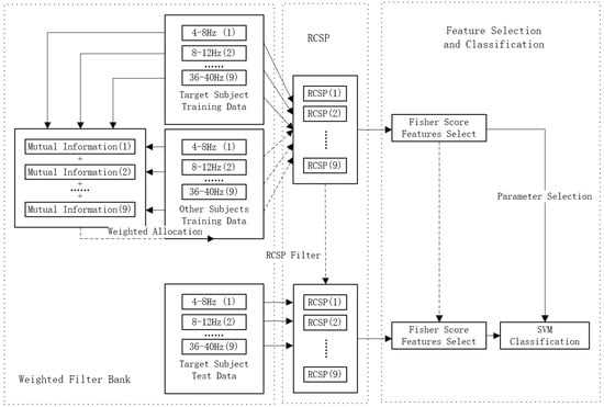 Based on the FBCSP framework, this study proposes an EEG-decoding method using a weighted filter bank regularized common spatial pattern (WFBRCSP) for feature extraction. The block diagram is exhibited in Figure 1, and the specific process is as follows.