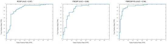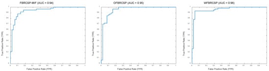 As exhibited in Figure 7, compared to other methods, the WFBRCSP method has the highest AUC value of 0.96, with the steepest ROC curve that is closest to the top–left corner. The WFBRCSP model exhibits the highest true-positive rate and the lowest false-positive rate among the methods exhibited. The experimental results exhibit that adjusting subject weights based on inter-subject correlation when processing EEG signals across subjects helps to improve the model’s generalization ability.