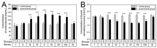 By contrast, the post hoc test of thyroid-stimulating hormone concentrations in rat blood plasma showed a significant decrease in TSH concentration from the experimental group compared with the control values in series III-VIII (p < 0.001). The concentration significantly decreased in series III compared with series II within the experimental group (p = 0.05) and significantly increased in series IX compared with series VIII (p < 0.001) within the same group. Similarly to corticosterone, no statistically significant differences between adjacent series within the control group were observed (Figure 1B).