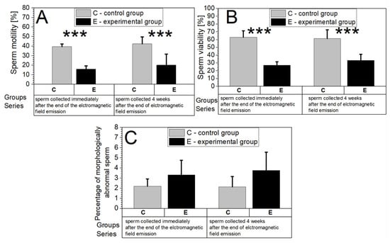 Sperm motility (A); sperm viability (B); mean percentage of morphologically abnormal sperm (C) in experimental and control rats. C—control group (no EMF exposure); E—experimental group (8 weeks of EMF exposure at 1800 MHz). ***—statistically significant difference at p ˂ 0.001 compared with the control value.