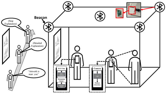 Museum guide systems possible to employ various methods for delivering artwork information, with manual entry of exhibit numbers and QR code scanning representing the predominant approaches. These techniques allow visitors to access relevant content by simply inputting the corresponding artwork number or capturing the associated QR code with their device, thereby efficiently retrieving comprehensive exhibit information. However, these conventional methods present significant accessibility barriers for individuals with visual impairments, as those intrinsically rely on the visual cues such as numbers and QR codes. Consequently, alternative approaches that do not depend on visual cues are demanded to deliver equivalent level of informational access to visually impaired visitors. Beacon-based guide systems do not require visual information. These systems use broadcasting packet [6] or proximity [6] or localization method [7,8] to provide the information. These systems can determine the time when the information is provided to the user. However, these do not consider whether providing the information continues or stops. Situations, where voice guidance that is unnecessary to the user continues, are inconvenient for visually impaired people who need a guide sound. Therefore, the guide system for visually impaired people needs to consider how to adaptively provide the information.