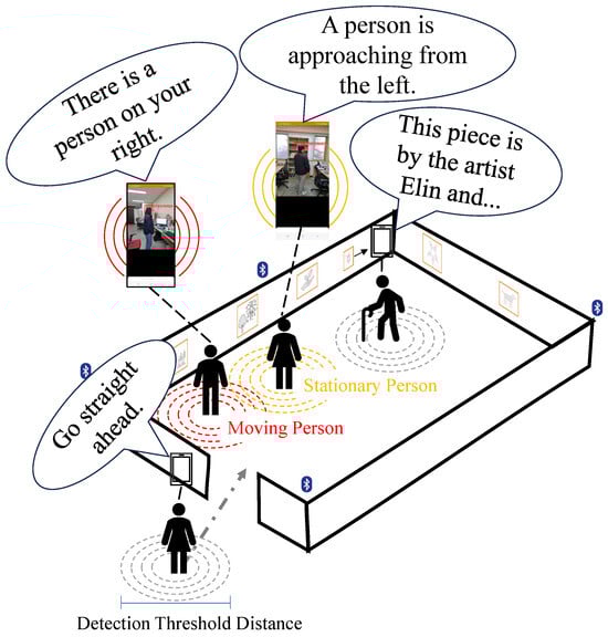 Visual senses are crucial for perceiving environmental changes and interacting with surroundings, individuals with visual disabilities face significant challenges when engaging in outdoor physical activities [1]. According to the 2023 statistics on disability in Korea, the disabled population stands at 2,652,860 as of 2022, with a registered disability rate of 5.12%. Among them, visually impaired individuals number 251,000, representing 9.5% of the total disabled population. The registered disabled population has seen a 10.9 times increase compared to 1992. However, data from the Ministry of Health and Welfare’s survey on disabled individuals’ participation in cultural activities reveals a cultural engagement rate of only 2% (https://www.peoplepower21.org/welfarenow/1940360 (accessed on 2 May 2025)). This restriction is especially noticeable when it comes to enjoying art and culture because it is difficult for people with disabilities to obtain visual information. Moreover, accessing art exhibitions can pose greater challenges as they often lack assistive equipment to facilitate smooth navigation for viewers [2,3].