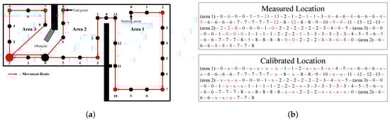 Figure 7. Scenario 1: (a): An established route. (b): Localization results when the user moves on the established route.