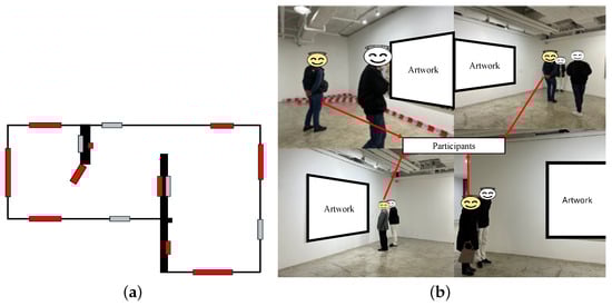 Figure 16. (a): Overview of the art gallery when the artworks were exhibited. (b): The situation where the participants use the proposed system.