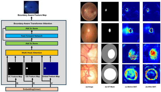 - Boundary-aware Transformer Attention (BAT): To explicitly model the anatomical inclusion relationship between the OD and OC, we designed the BAT module. The BAT module is incorporated into the skip connections of the U-Net architecture, enhancing boundary recognition capability by leveraging multi-resolution contextual features.