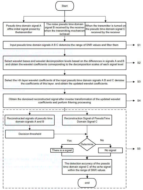 This study, based on signal spectra, defines the frequency domain as a “pseudo-time domain” and employs wavelet transform to identify specific structures within the pseudo-time domain waveforms. By applying wavelet transform in the “pseudo-time domain”, thresholds are established according to the characteristics of the transmitted signal and background noise after wavelet decomposition. This process effectively removes noise, significantly enhances the signal-to-noise ratio (SNR), and achieves a high detection success rate. Numerical simulations demonstrate that this method can handle received signals with SNR as low as dB or even lower, substantially increasing the SNR and achieving a notable denoising effect. When the SNR is dB, the maximum detection success rate can exceed . Outdoor experimental results show that the accuracy remains at even when the SNR is dB.