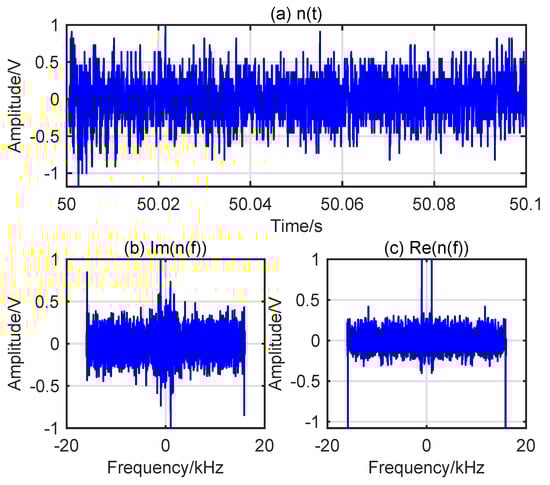 The open-loop experiment conducted in the outdoor environment captured all signals received by the transceiver from system startup to shutdown, as illustrated in Figure 7. The acquired time-domain waveform is partitioned into three characteristic segments: initial transient noise, stable external environmental noise, and post-shutdown system noise. Specifically, multiple stable segments from the second phase are selected as experimental background noise. The normalized time-domain waveform of the selected background noise is shown in Figure 8a, with corresponding pseudo-temporal domain representations provided in Figure 8b,c. These pseudo-temporal profiles reveal four distinct peaks from other interference sources, corresponding to spectral components at kHz and kHz.
