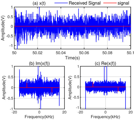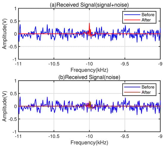 After adding the reference signal to the background noise to form a −30 dB received signal and normalizing it, the time-domain waveform is shown in Figure 9a, and the pseudo-time-domain waveforms are presented in Figure 9b,c. In Figure 9b, the two peaks of the red reference signal correspond to the spectral positions of the 10 kHz signal, which are completely masked by the noise. The denoising comparison of the received signal with an SNR of dB is shown in Figure 10. Figure 10a shows the pseudo-time-domain waveform of the received signal with the reference signal, and Figure 10b shows the pseudo-time-domain waveform of the received signal without the reference signal. From Figure 10a, it can be seen that the peaks at the frequency positions of the pseudo-time-domain waveform of the received signal with the reference signal are significantly larger after denoising. From Figure 10b, it can be seen that the peaks at the frequency positions of the pseudo-time-domain waveform of the received signal without the reference signal are much smaller after denoising.
