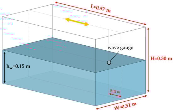 This section presents the results of a comparison between the numerical model used in this study and the experimental data from Liu and Lin (2020) [3] to validate the applied computational model. Figure 1 shows the dimensions of the 3D rectangular tank used in the experiment. The partially filled tank undergoes sinusoidal surge motion as described by Equation (1), induced by a shaker, and the free surface displacement is measured by a wave gauge positioned 0.02 m away from the wall.