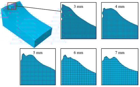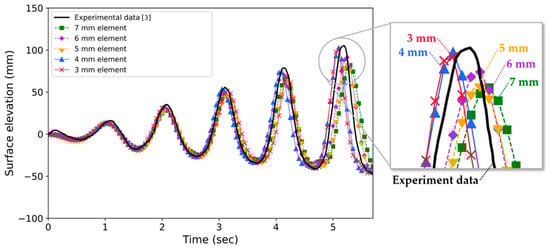 A mesh sensitivity study was conducted along with the validation test. The size of the Eulerian elements significantly affects the overall computation time, so simulations were performed with element sizes ranging from 3 mm to 7 mm to determine the optimized element size. Figure 3 shows snapshots of the free surface profile for each element size.