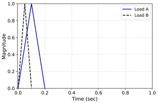To evaluate the effect of impulse duration on the accuracy of the results, two cases with different rise times were considered. As shown in Figure 5, the first case involved an impulse with a rise time of 0.05 s, while the second case used a rise time of 0.1 s, which is twice as long as the first. Despite this difference, both rise times are still sufficiently short to effectively simulate an impulse excitation that closely approximates the ideal Dirac delta function, given the practical limitations of numerical methods and computational constraints.