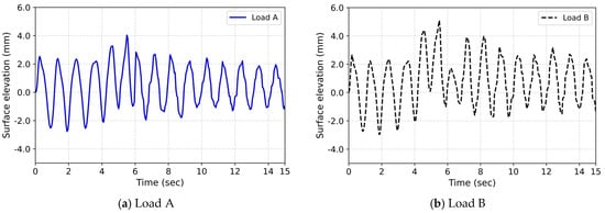When a rectangular tank undergoes translational motion as described by Equation (1), the natural sloshing period of the liquid inside the tank, derived from linear theory, can be expressed as Equation (2). Here, is the amplitude, and is the angular frequency. is the acceleration due to gravity, is the wave number, where , with representing the mode number. is the length of the tank, and is the water depth. Due to the nonlinear nature of the sloshing phenomenon, exact resonance may not always occur even when predicted by Equation (2). However, experimental studies have confirmed that for the lowest mode, the calculated values closely matched the observed results [10].