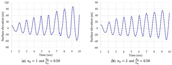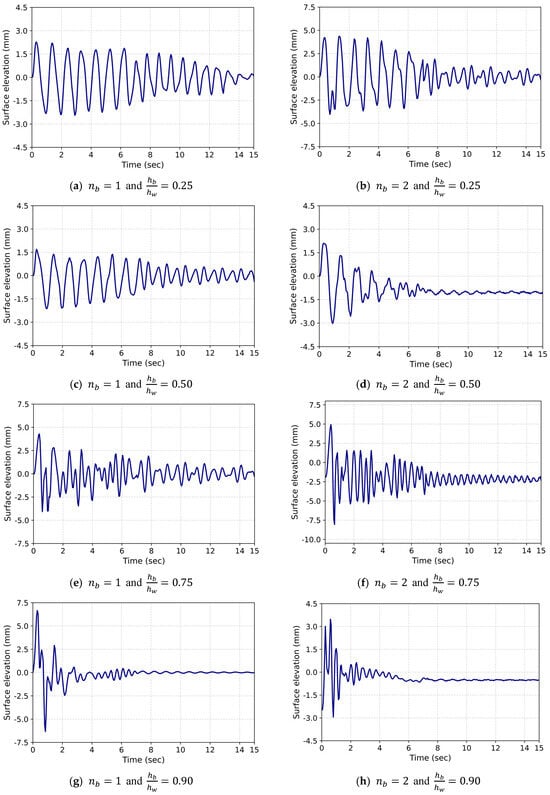 This section presents the results of numerical simulations performed by applying a unit impulse with a 0.05 s rise time to the cases summarized in Figure 8. As shown in Figure 1, the surface elevation was measured at a location 0.02 m away from the tank wall. The results from the 15 s simulation generally indicate that as the number of baffles increases from one to two, or as the baffle height increases, the vibrations decay more quickly as shown in Figure 9. This suggests that baffles play a significant role in controlling sloshing vibrations, with their effect becoming more pronounced as baffle height increases.