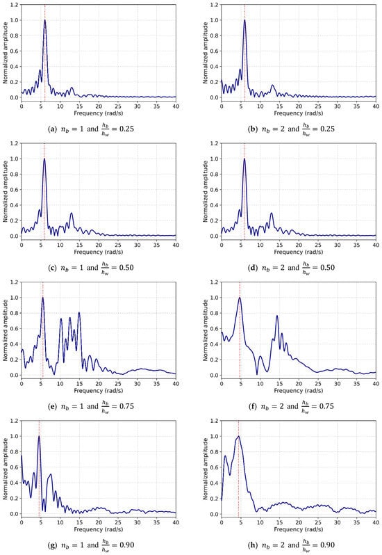 Figure 11 summarizes the lowest natural sloshing frequencies for each case. The results indicate that as the number of vertical baffles increases and their height rises, the lowest natural sloshing frequency consistently decreases. However, the trend differs depending on the number of baffles. For a single baffle, a sharp decrease in the lowest natural frequency occurs at , whereas for two baffles, a significant drop is observed at a lower height ratio of . A quantitative analysis of the nonlinear frequency shift shows that while the frequency decreases nearly linearly for lower baffle heights (), significant nonlinear deviations emerge at higher baffle heights. For a single baffle, the frequency deviation from the expected linear trend reaches approximately 5.0% at and increases sharply to about 20.8% at . Similarly, for two baffles, the deviations are about 20.0% and 24.1% at and 0.90, respectively. These results quantitatively confirm that strong nonlinear effects arise when the baffle height exceeds approximately 75% of the water depth, especially in configurations with multiple baffles. Therefore, special attention must be paid when determining the natural sloshing frequencies of baffled tanks, as nonlinear effects can significantly alter the dynamic response.