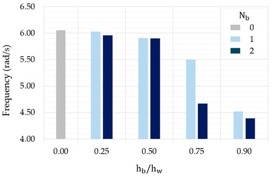 We compared the result of this study with the closed-form equations for the natural sloshing frequency of a tank with vertical baffles, as introduced in Section 2.1 (specifically, the equations by Shin et al. (2006) [16] and Hu et al. (2018) [17]). To compare with the equation from Shin et al. (2006) [16], we first calculated the effective fill-depth () based on the number and height of the baffles, and we then plotted the relationship between this effective fill-depth and the lowest natural sloshing frequency in Figure 13a. However, for comparison with the equation from Hu et al. (2018) [17], the effective baffle height-to-tank length ratio was calculated, and the results were plotted in Figure 13b.