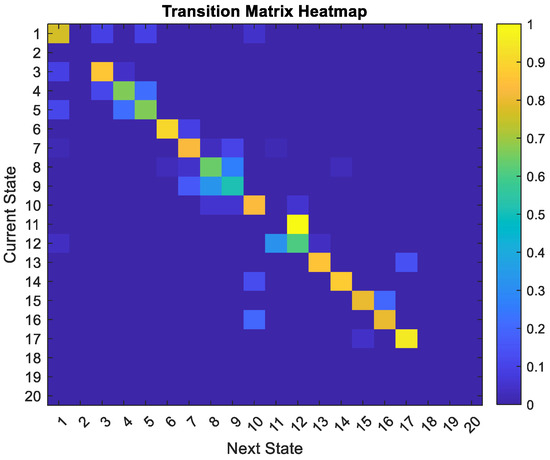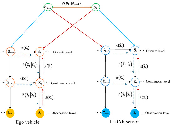The hierarchical DBN model is illustrated in Figure 5. Odometry data is used to determine the position of the ego vehicle on the left side of the DBN. There are seven different tracks on the right side, provided by the LiDAR sensor. A layer of observations is located at the bottom, where raw sensor data have been collected. The middle level of the model (i.e., a continuous level) represents our generalized states. Through the use of the GNG algorithm, the third upper layer is a discrete layer that allows us to group the generalized states into clusters. Lastly, dictionary interactions occur at the top of the DBNs, where clusters derived from GNG are considered, enabling interaction between tracked objects and the ego vehicle. A switching variable is incorporated into the DBN to distinguish static tracks from dynamic tracks according to predefined mathematical equations. As a result, these classifications play a crucial role in extending learned vocabularies during testing, particularly for localizing the ego vehicle. For this purpose, separate dictionaries are maintained for each track and ego vehicle, each containing six columns of information: time, the cluster index of the ego vehicle, the cluster index of the track, the interaction label, as well as the x and y positions of the ego vehicle. It is especially useful for predicting the position of the ego vehicle to have the interaction label, which indicates whether it is interacting with a specific track at a given time. Using these dictionaries to analyze interaction labels and spatial data, the model can more accurately predict the ego vehicle’s position relative to static tracks. This is achieved using an MJPF, which combines the strengths of Kalman filters and particle filters. Utilizing the consistent patterns in the static tracks’ data, the MJPF refines the positional estimates by comparing predictions from the DBN with real-time observations. Whenever the switching variable indicates a static state, the DBN leverages the corresponding dictionary entries to provide more accurate and robust localization of the ego vehicle. The use of this approach ensures that the localization process is both data-driven and mathematically based, greatly improving the accuracy and reliability of navigation on the ego vehicle.