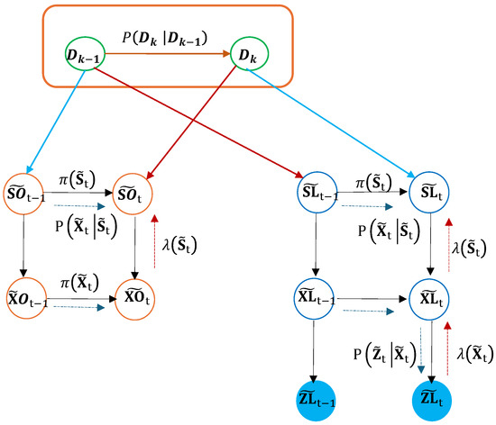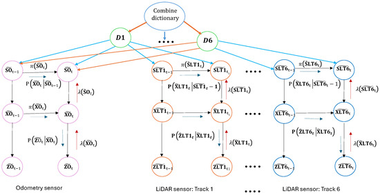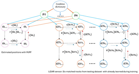 During the online testing phase, we employ a LiDAR-based dataset consisting of track observations captured in realistic driving scenarios. The localization process leverages vocabulary and interaction dictionaries learned during the offline training phase. The proposed framework comprises distinct steps: track-cluster matching, particle initialization, prediction, and update phases. Importantly, the integration of combined interaction dictionaries allows for the simultaneous handling of multiple static tracks, periods without observations, and isolated track interactions. The DBN model during testing for seperate tracks predictions is shown in Figure 6.