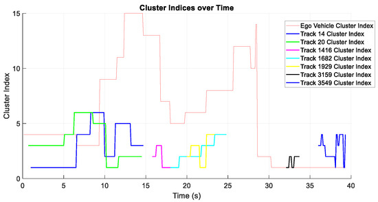 The timing analysis was conducted for interactive clusters where both the ego vehicle and each track were simultaneously present in the space at the same time. Track 14 interacted with the ego vehicle from 1 to 14.7 s. Similarly, Track 20 had interactions with the ego vehicle from 0.7 to 14.5 s. Interactions for Track 1416 began at 15.8 s and ended at 18 s. Track 1682’s interaction took 18 to 24.8 s. Track 1929 interacted with ego vehicle from 20 to 23.4 s. The interaction time between track 3159 and ego vehicle occurs from 32.1 to 33.7 s. Finally, Track 3549 interacted with the ego vehicle between 36 and 39.3 s. Table 1 shows the initial part of the interaction array which belongs to the interactions between the ego vehicle and track 14. The track cluster index of 0 indicates that there was no interaction at that time, so the first interaction began at 1.000 s. Note that this interaction continues until the end of a particular interaction, maintaining separate interaction arrays for the ego vehicle and for each track.