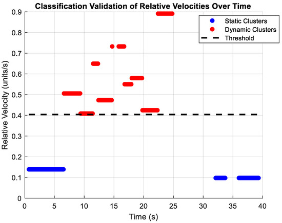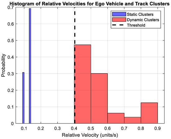 During the final stage of offline training phase, we classify tracks based upon the interaction between the clustered states of the ego vehicle and the clusters of the tracks. The interaction between an ego vehicle and a dynamic track cluster should be classified as dynamic, while the interaction with a static track cluster should be classified as static. The relative velocities of the ego vehicle and the track clusters determine whether a track is static or dynamic. This is achieved by measuring the difference between the ego vehicle’s velocity and those of each track cluster over a period of time. The relative velocities are plotted in a histogram (see Section 4), and the mean plus one standard deviation () of the plotted values is used as a threshold to distinguish static and dynamic tracks. This helps to classify interactions in a robust manner, with dynamic velocities appearing above the threshold and static velocities appearing below it. This thresholding method, which is based on the mean and standard deviation, is chosen due to its statistical robustness. It not only considers the central tendency of relative velocities but also accounts for the variability in the data, enabling adaptive classification across heterogeneous environments. By setting the decision boundary dynamically, the approach becomes less sensitive to outliers and better suited to generalize across diverse driving contexts. We validated its effectiveness across two datasets, i.e., iCAB and KITTI, achieving classification accuracies of 87% and 82%, respectively, with F1 scores of 91% and 85% (see Section 4). These metrics confirm the reliability of the method across varying scenarios, including structured urban environments and dynamic traffic conditions.