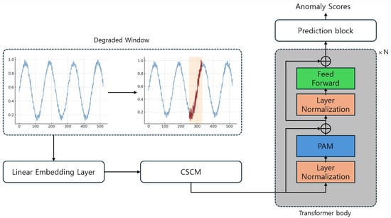 Self-Supervised Pyramidal Transformer Network-Based Anomaly Detection (SPT-AD) is a transformer-based algorithm that performs time series anomaly detection by generating anomaly data through self-supervised learning. An algorithm called AnomalyBERT was proposed based on the motif of BERT, which uses only the encoder structure of the transformer []. In this paper, we propose a new architecture SPT-AD based on the AnomalyBERT architecture, which replaces the core component of the multi-head self attention (MSA) with the Pyramidal Attention Module (PAM) of Pyraformer and adds a Coarse-Scale Construction Module (CSCM) to improve the anomaly detection performance and computational efficiency of time series data []. The proposed model overcomes data imbalance while maintaining synthesis outliers through a data degradation method and effectively learns temporal and inter-variable correlations utilizing multi-resolution representation through the Pyramidal Attention Module. This section describes the proposed model structure and algorithms in detail. The overall structure of the model is shown in Figure 1.