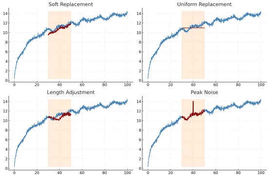 - Soft Replacement: This method introduces subtle changes by replacing portions of the original data with smoothed values. It reflects gradual anomalies that appear over time, enabling the model to detect progressive deviations.