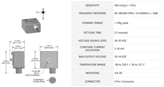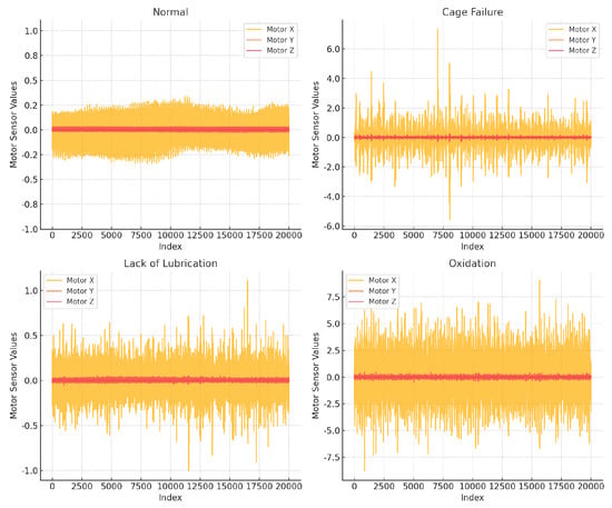 In mechanical installations, vibration defects typically refer to vibrations that occur when abnormal motion occurs in a machine part or structure. These vibration faults can reveal the reliability, performance, and lifespan of a machine. Therefore, it is important to detect and respond to them early. Vibration faults can be caused by a variety of reasons, including imbalanced parts, misalignment, wear, breakage, interference between machine parts, pressure changes in fluids, poor assembly, and damaged bearings [,]. For example, bearing defects cause vibrations with high-frequency components, while gear defects can produce low-frequency vibrations []. Identifying these vibration faults typically involves measuring and analyzing the vibration of the machine using sensors such as accelerometers, velocimeters, and displacement meters []. This process enables the identification of abnormal vibrations compared to the normal operating state of the machine and determines the causes of the defects. Recent advances in sensor technology and data acquisition devices have created an environment where large-scale vibration data can be analyzed in real time, and if machine learning or deep learning anomaly detection algorithms are utilized, it is possible to monitor facilities in real time and identify defects at an early stage to recognize problems quickly and respond effectively [].
