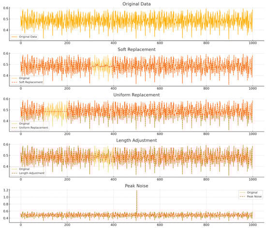Figure 8 illustrates the application of synthetic outlier generation methods to the original data. We utilized four types of synthetic outliers: soft replacement, uniform replacement, length adjustment, and peak noise. Each method was designed to allow the model to indirectly learn the characteristics of abnormal data without requiring labeled anomaly data.