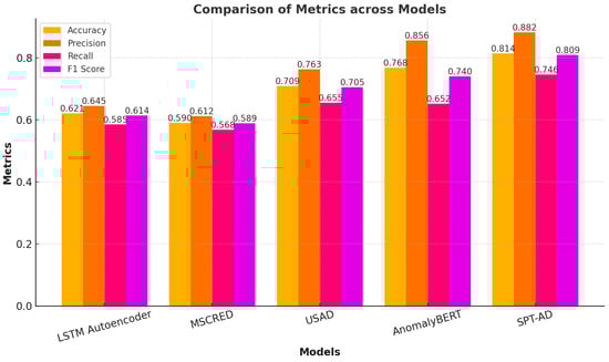 Figure 9 shows the comparison of performance metrics (accuracy, precision, recall, and F1-score) between the LSTM Autoencoder, AnomalyBERT, and proposed SPT-AD model. Each metric was used as the main criterion to evaluate the anomaly detection performance of the model. This demonstrates that the design utilizing data degradation techniques and multi-resolution processing was effective, showing that the SPT-AD model provides higher accuracy and balanced precision and recall in anomaly detection compared to the existing models.