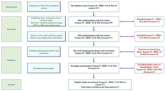 Systematic research requires defining and developing a search strategy to identify relevant literature. This strategy includes three major scientific databases: Web of Science, Scopus, and IEEE. These databases are among the largest repositories of scientific and technical publications and contain a wealth of high-quality research. One of the search terms used in the databases was “brain tumor”. In the initial research phase, the search scope was limited to studies published between 2014 and 2024.