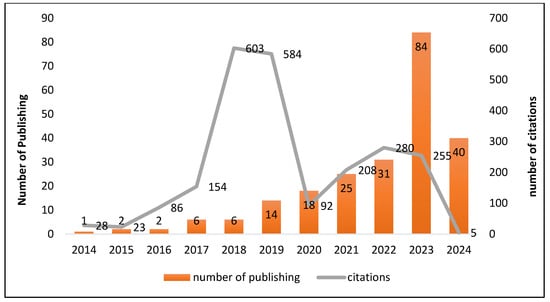 Number of citations and publications per year from 2014 to 2024 in Scopus.