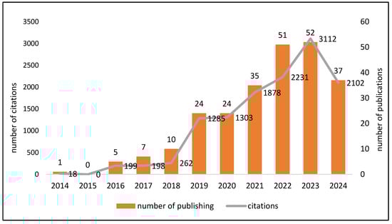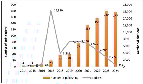 Number of citations and publications per year from 2014 to 2024 in Web of Science.