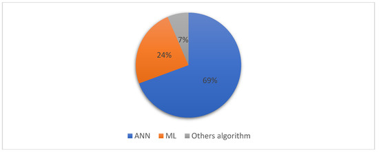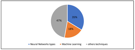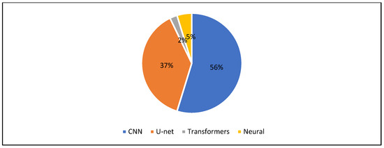 Figure 5 presents the overall distribution of AI techniques, indicating that neural networks account for 69% of all approaches. Among these, convolutional neural networks (CNNs) are the most widely utilized, as depicted in Figure 6 (56%), followed by U-Net (37%) and transformers (2%).