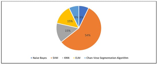 Figure 7 details machine learning methods, highlighting supervised learning techniques, such as naïve Bayes, support vector machines (SVM), and k-nearest neighbors (KNN). SVMs contribute 54% to the supervised learning category, followed by KNN (15%) and extreme learning machine (ELM) (15%).