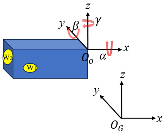 The coordinate system of the inclinometer is taken as the vehicle body coordinate system {O}, with the coordinates of calibration points and in the vehicle body coordinate system {O} denoted as , , , and , and the coordinates in the tunnel coordinate system {G} denoted as and . The vector formed by two points in the {O} coordinate system is denoted as , and the vector in the {G} coordinate system is denoted as , that is,