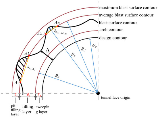 Based on the analysis of the over-excavation and under-excavation, the maximum blast face profile, blast face profile, and average blast face profile of the actual tunnel contour are determined. Combined with the tunnel design contour and the arch profile, the tunnel spraying layers are divided into the pit-filling layer, filling layer, and sweeping layer, with their respective thicknesses denoted as δ1, δ2, and δ3. Rg, Rb, Rj, and Rd represent the arch profile radius, blast face profile radius, average blast face profile radius, and design profile radius, respectively. Δ is the distance between the blast face profile and the design profile, as shown in Figure 2.