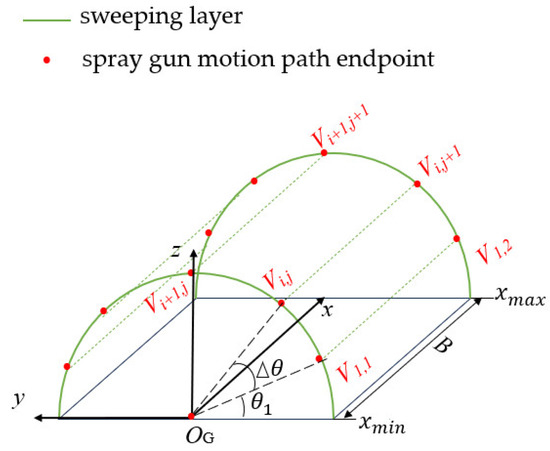 The first operational endpoint of the sweeping layer is selected in the region with the extreme mileage of the tunnel to be sprayed. The height from the ground is determined by the safe distance maintained between the spray gun and the tunnel floor. Its coordinates U(X,Y,Z) are obtained via vehicle-mounted radar scanning. The first spray gun motion path endpoint V11(X,Y,Z) is calculated using Formula (25). Let the difference in the extreme mileage of the tunnel’s spraying region be B, as shown in Figure 9. The coordinates of the spray gun motion path endpoint are calculated as follows: