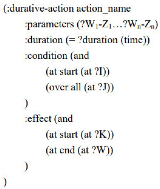The definition of an action includes five components. The action_name refers to the name of the action, while parameters define the parameters associated with the action. Moreover, duration indicates the duration, which can either be a fixed value or a time function that determines the value. Additionally, condition represents the preconditions for the action, and effect describes the results following the execution of the action, as shown in Figure 12.