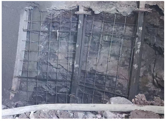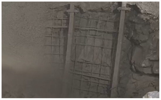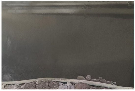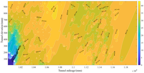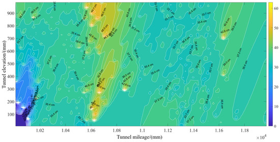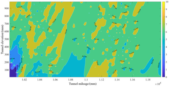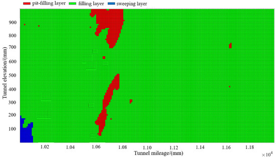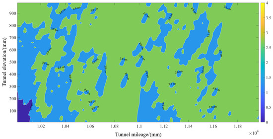 Under normal operating conditions, the concrete spraying flow rate of the wet-spray jumbo is approximately 6 m3/h, and the air pressure is approximately 1.2 MPa. The dwell time at the stopping points for the patching layer and filling layer is calculated using Equations (25) and (31), respectively, while the nozzle movement speed for the sweeping layer is determined by Equation (33). The tunnel blasting surface shown in Figure 15 was selected as the target spraying area for the experimental coating process. Based on the over-excavation values of the spraying area, a contour map with an interval of 2 cm is drawn, as shown in Figure 16. The spraying area is divided into a grid, and the over-excavation and under-excavation values for each grid are determined by the average over-excavation value of the point cloud data within that grid. To ensure the accuracy, the grid cell size is set to 1 cm. Based on the over-excavation and under-excavation values of the spraying area, a layer classification is performed. The over-excavation range of 40 cm to 50 cm is designated as the patching layer, 10 cm to 40 cm as the filling layer, and 0 cm to 10 cm as the sweeping layer. The layer classification results are shown in Figure 17.
